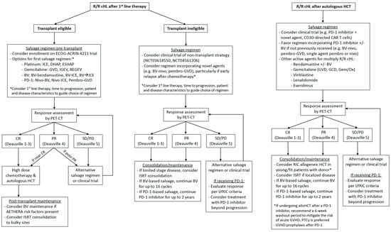 In general, treatment of relapse after AHCT varies based on patient-related factors (age, performance status, comorbidities), disease-related factors (tumor bulk, localized vs. systemic disease), and prior therapies. Most patients who relapse after AHCT are treated with palliative intent; however, a subset of patients may achieve cure or durable remissions. For patients with localized recurrence after AHCT, we consider post-transplant RT [67,68,69]. For patients with systemic relapse after AHCT, we favor a PD-1 inhibitor and/or BV-based regimen if not previously administered or if previously responsive to these agents. For young, fit patients, we recommend HLA typing to identify a suitable donor, and those who achieve CR or good PR with salvage therapy should be considered for consolidative allogeneic HCT.