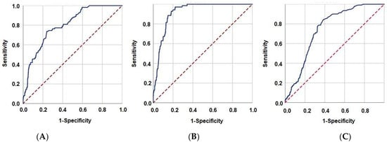 Receiver operating characteristic curve analysis results depicting the association between the pretreatment Global Immune-Nutrition-Inflammation Index values and survival outcomes: (A) Locoregional progression-free survival, (B) Progression-free survival, and (C) Overall survival.