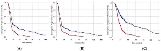 Survival outcomes per Global Immune-Nutrition-Inflammation Index (GINI) groups (Dark blue: GINI < 1562; Red: GINI ≥ 1562): (A) Locoregional progression-free survival, (B) Progression-free survival, and (C) Overall survival.