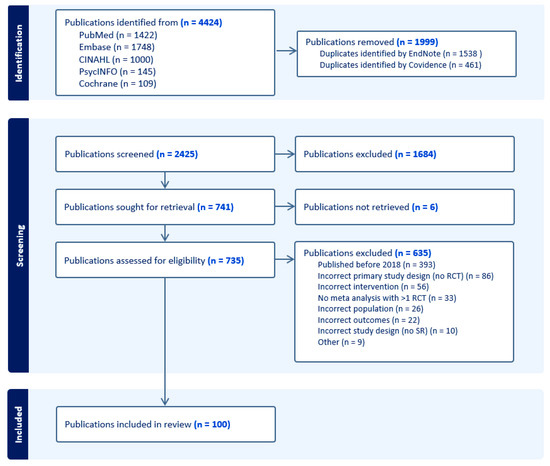 After full text screening for eligibility, 100 systematic reviews were included in the overview (Figure 1). A detailed overview of the included studies and extracted data can be found in Table S1.