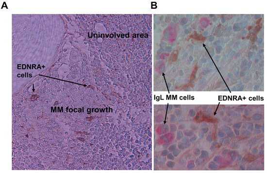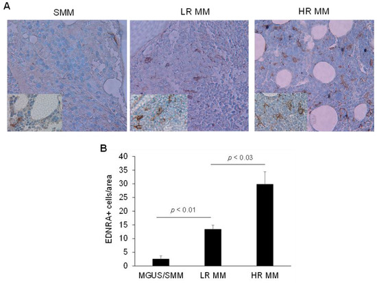To test whether EDNRA+ cells were found more frequently in MM samples, we performed IHC for EDNRA to detect EDNRA+ cells in BM samples from patients with MGUS, SMM, LR MM, or HR MM. We then quantified the number of EDNRA+ mesenchymal cells in the interstitial BM of each sample. The number of EDNRA+ mesenchymal cells was 5.3-fold higher in patients with LR MM than in patients with MGUS or SMM (p < 0.01) and was 2.2-fold higher in HR MM patients than in LR MM patients (p < 0.03, Figure 4). In patients with LR MM, EDNRA+ cells were more evident in highly involved areas and were absent in uninvolved interstitial BM (Figure 5A). Double staining for EDNRA and clonal immunoglobulin light chain expressed by MM cells revealed EDNRA+ mesenchymal cells near MM cells (Figure 5B).