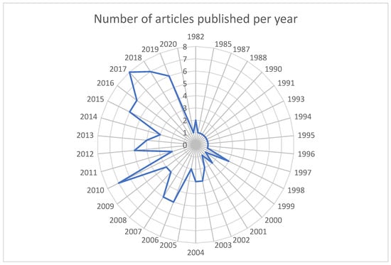 The research on cytotoxic drugs is of significant current relevance, representing the primary key finding from our analysis. When examining the temporal evolution of the most relevant articles, it becomes evident that the publication distribution from year to year underscores the contemporary and substantial nature of this topic. Specifically, 55 out of the 100 relevant articles have been published from 2010 to the present day. Within the last decade, spanning from 2013 to 2022, 41 articles have been contributed. Furthermore, in the past five years, from 2017 to the present, our ranking includes 22 papers (see Figure 1).