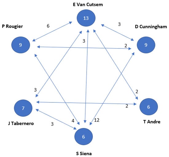 Relationship between the authors with 6 or more publications on a topic. Numbers inside the circles indicate the number of articles published. Connecting arrows and numbers affixed indicate number of papers together, respectively.