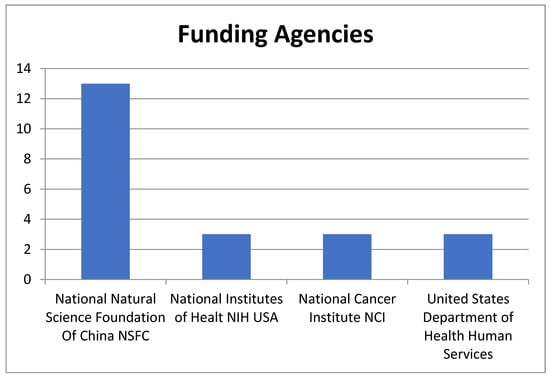 Additionally, the primary institutions that have funded these papers underscore the significance of this topic. Public institutions from two of the world’s most influential countries, the National Natural Science Foundation of China (NSFC) and American institutions such as the National Institutes of Health and National Cancer Institute, have provided funding various of the T100 papers. The NSFC has funded 13 papers, while American institutions have funded 3 papers within the T100, according to the data obtained from WOS (see Figure 5).