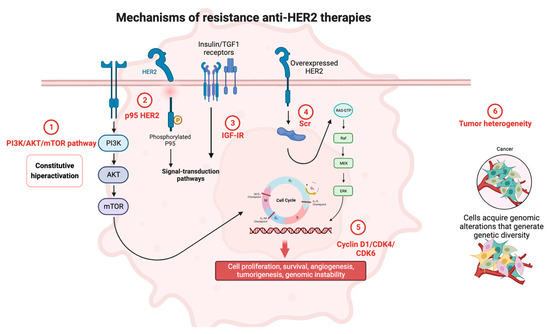 Cyclin D1/CDK4/CDK6 may also be a mechanism of resistance to anti-HER therapies in BC. Cyclin D1 (CCND1) is a protein whose function is to regulate the G1 to S phase transition in the cell cycle, and is usually overexpressed in BC. This overexpression has been associated with poor response to anti-HER2 therapies [25]. CCND1 overexpression can activate CDK4 and CDK6, leading to increased cell proliferation and decreased sensitivity to anti-HER2 drugs [26]. Additionally, some studies have shown that CDK4/6 inhibition can improve the response to anti-HER2 therapies. Preclinical studies have demonstrated that the combination of CDK4/6 inhibitors with anti-HER2 therapies results in increased tumor growth inhibition and enhanced cell death in BC cells [27].