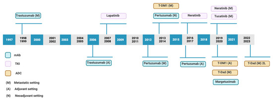 The human epidermal receptor type 2 (HER2) protein is a member of the ErbB/HER family of transmembrane tyrosine kinases, which also includes EGFR, HER3, and HER4, and is overexpressed in approximately 15% of all BCs. This characteristic confers aggressive behavior and a poor prognosis [3]. However, with the emergence of HER2-targeted therapies over the last few decades, patients’ prognoses have improved. Concretely, trastuzumab was the first HER2-targeting monoclonal antibody to be developed, and this advancement represents a significant achievement in the management of solid tumors.