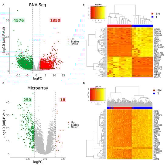 (A) Volcano plot indicating differentially expressed genes (DEGs) in brain metastases (BM) compared to the primary tumor (T) in RNA-seq data (red and green colors indicate |logFC| > 2 and adj. p < 0.05; other genes are colored gray. (B) Hierarchical cluster showing the expression profile of the top 100 DEGs in the RNA-seq data. (C) Volcano plot indicating differentially expressed genes (DEGs) in brain metastases (BM) in comparison to the primary tumor (T) in the microarray data (red and green colors indicate |logFC| > 1.5 and adj. p < 0.05; other genes are colored gray. (D) Hierarchical clustering showing the expression profile of the top 100 DEGs on the microarray data.