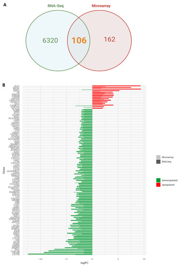 (A) Venn diagram showing the overlap between differentially expressed genes (DEGs) between RNA-seq and microarray data. (B) Bar graph indicating logFC values and expression direction of the 106 DEGs superimposed across sequencing technologies.