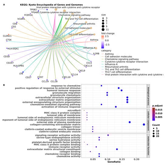 To obtain information about functional mechanisms regulated by the 102 DEGs, analyses of functional annotation and pathway enrichment were performed. In the analysis of the Kyoto Encyclopedia of Genes and Genomes (KEGG) pathway, enrichment of the following molecular pathways was identified: cell adhesion, chemokine signaling, cytokine–cytokine receptor interaction, and Th1, Th2, and Th17 cell differentiation pathways (Figure 4A) (Table S8). The dysregulated expression of these genes may play a crucial role in modulating immune responses and cell-to-cell communication processes. Furthermore, functional enrichment analysis was conducted to predict the biological functions associated with the DEGs. This analysis identified biological processes related to the immune response, chemokine response, and extracellular matrix organization. These findings suggest that the DEGs may be involved in immune-related processes. Moreover, the enrichment of cellular component terms mainly associated with the cell membrane indicates that the DEGs may have important roles in membrane-associated functions and signaling processes (Figure 4B) (Table S9).