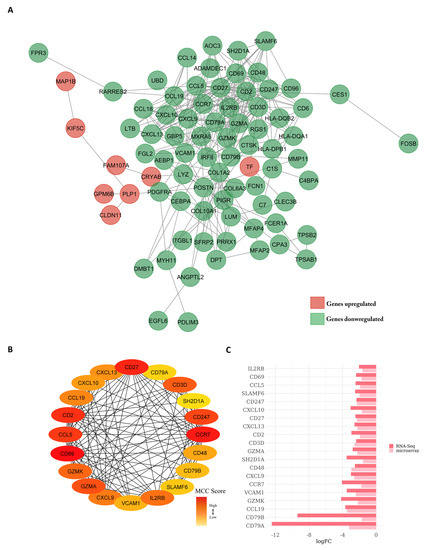 (A) Protein–protein interaction network (PPI) visualized with Cytoscape. The nodes represent the proteins. Borders highlight interactions between proteins. Upregulated genes are marked in red and downregulated genes are marked in green. (B) ‘Hub’ genes. The color red to yellow represents the degree of connectivity from top to bottom. (C) Bar chart indicating logFC values and expression direction of the 20 ‘hub’ genes.