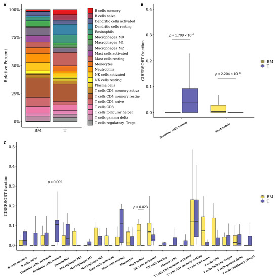 (A) Infiltrating immune cell composition in brain metastasis (BM) and primary tumor (T) is summarized from mean values calculated for each group. The bar graph shows the difference between CIBERSORTx immune cell fractions between brain metastases (BM) and primary tumors (T). (B) Results were generated using microarray data. (C) Results were generated using RNA-seq data.