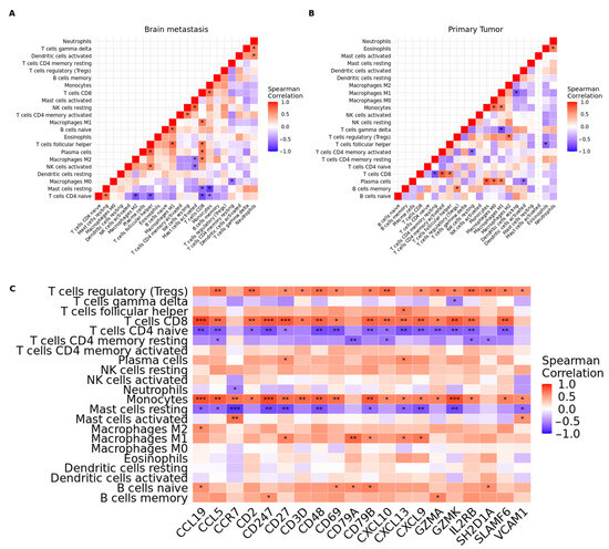Correlation matrix of all 22 immunological proportions. (A) Brain metastasis. (B) Primary tumor. * represents significant correlations (p < 0.05). (C) Correlation plot (Spearman correlation coefficients) of ‘hub’ gene expression and proportion of infiltrating immune cells in brain metastasis. Colors in the heatmap indicate the strength of the correlation. Asterisks indicate the level of significance (* p < 0.05, ** p < 0.01, *** p < 0.001).