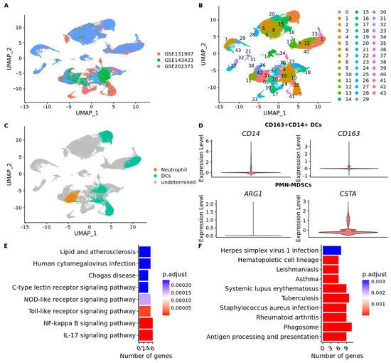 (A) The distribution of cells in each cluster according to the dataset. (B) 57,774 cells were divided into 43 separate clusters. (C) After annotation of cell type dendritic cells and neutrophils were found. (D) Violin plots of the expression of marker genes of neutrophil and dendritic cell subtypes. The violin plots to all the markers are shown in Figure S4. (E) Bar chart of enrichment analysis based on KEGG database for PMN-MDSCs. The X-axis shows the number of genes that enrich the pathway and the color of the bars represents the adjusted p value. (F) Bar chart of enrichment analysis based on KEGG database for CD163 + CD14+ dendritic cells. The X-axis shows the number of genes that enrich the pathway, and the color of the bars represents the adjusted p value.