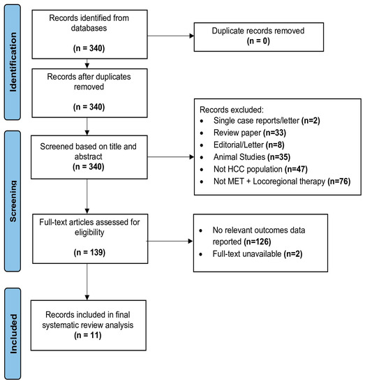 The eligibility criteria for this systematic review included the following: (1) the study enrolled adult patients (>18 years); (2) the patients in the study had a diagnosis of hepatocellular carcinoma; (3) the study consisted of patients who underwent locoregional therapy for HCC, including radiofrequency thermal ablation (RFA), yttrium-90 (Y90) radioembolization, transarterial chemoembolization (TACE), transarterial radioembolization (TARE), microwave ablation (MWA), and external-beam radiotherapy (EBRT), including conventional external beam radiation, stereotactic body radiotherapy (SBRT), hypofractioned radiotherapy (HypoRT), and particle therapy (gamma ray or neutron ray); (4) patients were concomitantly taking metformin during LDT. Any studies that were (1) case series including fewer than four patients, (2) case reports including fewer than four patients, (3) reviews, letters, editorials, or animal studies, or (4) did not report relevant outcomes were excluded during the initial screening of titles and abstracts. Studies that reported outcomes on patients undergoing liver resection, transplantation, or systemic chemotherapies were also excluded.