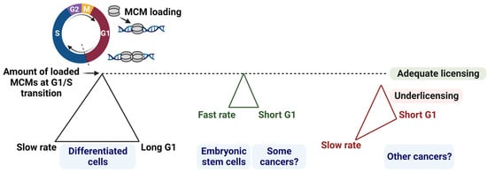 G1 length, MCM loading amount, and rates must be tightly coupled to maintain genome integrity. The figure illustrates the conceptual relationships among the three parameters. MCM loading increases gradually in G1 until it reaches the maximum loaded amount of MCMs at the G1/S transition (depicted with the dotted line). (Left triangle): G1 length and MCM loading rates must be tightly coordinated to achieve adequate origin licensing. (Middle triangle): a short G1 must be counterbalanced with fast MCM loading rates to achieve adequate licensing at the G1/S transition, and fast licensing is a characteristic of embryonic stem cells. The rates of licensing in at least a subset of cancer cells are expected to be fast although they have not yet been directly measured in different cancer types. (Right triangle): if MCM loading rates are not fast enough in cells with a short G1, cells will suffer underlicensing and incomplete DNA replication [10]. Created with BioRender.com, accessed on 29 August 2023.