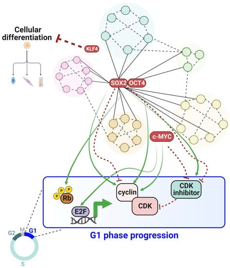 Somatic differentiated cells can be reprogrammed into induced pluripotent stem cells (iPSCs) by the four “Yamanaka reprogramming factors” (SOX2, OCT4, KLF4, and c-MYC), or different combinations of other transcription factors or chemical compounds [14,96,97]. Moreover, these factors—among others—comprise a core pluripotency network in embryonic stem cells (ESCs), but they are normally silenced in normal differentiated cells, except for some tissue-specific adult stem cells. Interestingly, some cancers can aberrantly re-express some of these factors, which contribute to a resistance to cancer therapy [98]. We will discuss below how SOX2, OCT4, KLF4, and c-MYC regulate G1 dynamics in stem cells and cancer cells.