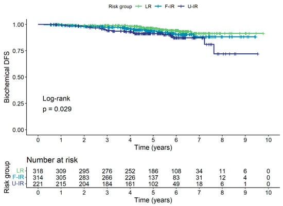 Biochemical relapse was detected in a total of 58 (6.8%) patients. The 5-year biochemical disease-free survival (bDFS) was 94.1% for the entire cohort, and 96.5%, 93.7%, and 91.2% for the LR, F-IR, and U-IR groups, respectively. The Kaplan–Meier curve for bDFS is shown in Figure 1.
