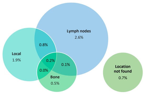 The localization of relapse was as follows: local in 16 (1.8%) patients, nodal in 22 (2.6%) patients, bone in 4 (0.5%) patients, combined in 10 (1.2%) patients, and not localized in 6 (0.7%) patients. The location of PSA relapse is shown in Figure 2.