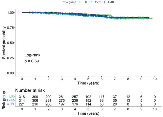 Forty (4.7%) patients died in total, with none of the deaths attributed to prostate cancer. The 5-year OS was 95.6% for the entire cohort, and 96.2%, 94.8%, and 95.9% for the LR, F-IR, and U-IR groups, respectively. The Kaplan–Meier survival curve for OS is shown in Figure 3.