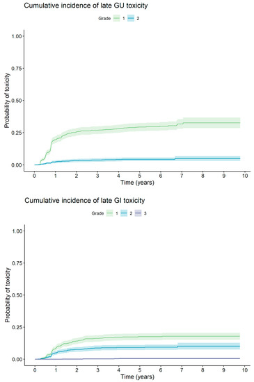 Late toxicity was graded according to CTCAE v4.0. The cumulative 5-year gastrointestinal (GI) toxicity of G1, G2, and G3 was 17.5%, 9.1%, and 0.5%, respectively. The incidence of G2+ GI toxicity during the whole follow-up period for individual subgroups was 6.0%, 9.2%, and 14.4% for the LR, F-IR, and U-IM groups, respectively. The cumulative 5-year genitourinary (GU) toxicity of G1 and G2 was 29.4% and 4.3%, respectively. GU toxicity of G3 and higher was not noted. The incidence of G2+ GU toxicity during the whole follow-up period for individual subgroups was 3.8%, 4.1%, and 4.6% for the LR, F-IR, and U-IM groups, respectively. The incidence of late GI and GU toxicity is shown in Figure 4.