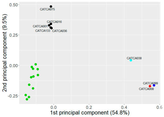 Tumor tissue from all included patients harbored at least one mutation covered by the cfDNA Oncomine panel (Table 1 and Table 2). Two patients showed abnormal SNVs in the plasma cfDNA. In patient CATCA016, who presented with metastasized CRC, concordance was observed between tissue and cfDNA for two somatic variants (Table 1). Patient CATCA008 presented with an SNV in the cfDNA that was not present in the tissue, despite being covered in both sequencing panels. Since only five molecules were detected, this might have been an artifact. Alternatively, this observation could be due to tumor heterogeneity, clonal hematopoiesis, or sampling error [38,39]. In the remaining six patients, no alterations were detected in cfDNA.