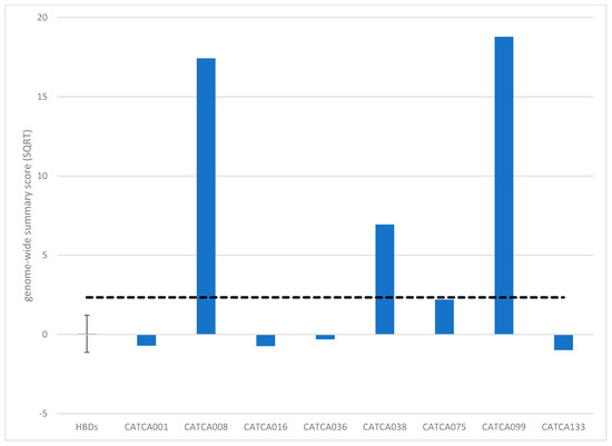 Summary methylation scores upon genome-wide methylation analysis (MeD-seq) based on the entire genome (genome-wide summary score). Genome-wide summary scores above 2.34 were considered elevated (dashed line).