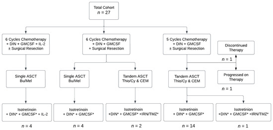 Flow diagram showing treatment patients received. Abbreviations: dinutuximab (DIN), granulocyte-macrophage colony-stimulating factor (GM-CSF), interleukin-2 (IL-2), autologous stem cell transplantation (ASCT), busulfan/melphalan (Bu/Mel), thiotepa/cyclophosphamide (Thio/Cy), cisplatin/etoposide/melphalan (CEM), irinotecan (IRN), temozolomide (TMZ). * Omitted in Cycle 6.