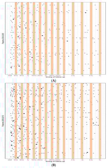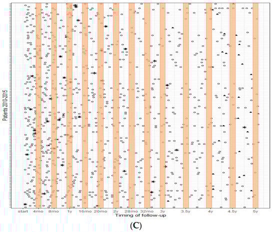 Follow-up patterns over 5 years; (A) (top) patients who had surgery between 2000–2005, (B) patients who had surgery between 2005–2010, and (C) (bottom) patients who had surgery between 2010–2015. Each row represents each patient’s time at risk; the orange bars indicate the advised timing of follow-up based on the guidelines. ○ = surveillance imaging; * = recurrence; ⯅ = maximum time at risk.