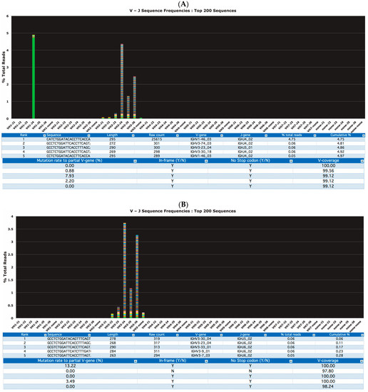 Representative clonal (A) and polyclonal (B) cases visualized by LymphoTrack® MiSeq software. The software determined the DNA sequence, the V-J assignment, raw sequence counts, frequency of rearranged IGH, degree of somatic hypermutation (SHM), presence of stop codons and the % coverage of the canonical V gene sequence.