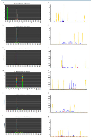 Representative clonal and polyclonal cases by NGS (A–F) and BIOMED-2 PCR (G–L). (A): Positive control (538,906 total reads). (B): Negative control (558,864 total reads). (C): Positive sample (#4) (545,858 total reads). (D): Oligoclonal sample (#57) (18,056 total reads). (E): Polyclonal sample (#61) (744,191 total reads). (F): Discordant sample (#54) (822,638 total reads). (G): Positive control; (H): Negative control (I): Positive sample (#4). (J): Oligoclonal sample (#57). (K): Polyclonal sample (#61); (L): Discordant sample (#54).