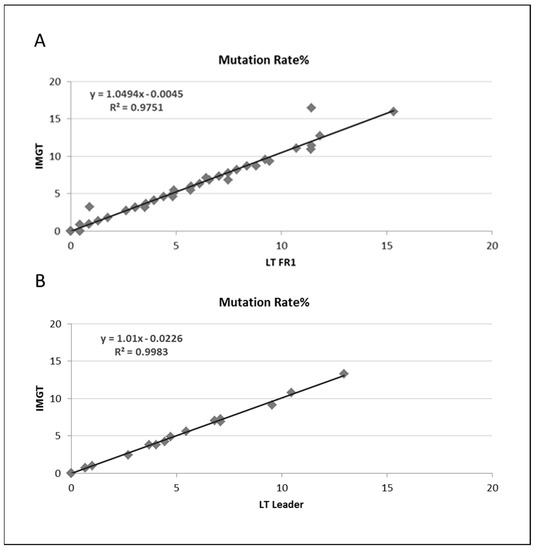 (A) Comparison of somatic hypermutation (SHM) rates determined by LymphoTrack® FR1 with LymphoTrack® software versus LymphoTrack® FR1 with IMGT for 68 samples. (B) Comparison of SHM rate determined by LymphoTrack® FR1 with LymphoTrack® software versus LymphoTrack® Leader with LymphoTrack® software for 28 samples (LymphoTrack® = LT in the figure).