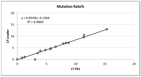 Comparison of somatic hypermutation (SHM) rates determined by LT FR1 with LT software versus LT leader with LT software for 28 samples.