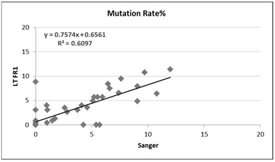 On the other hand, when mutation frequency obtained by Sanger sequencing and NGS assays were compared, we documented an 84% (37 out of 44) concordance between Sanger sequencing and the IGH FR1 assay (Table 4 and Figure 5).