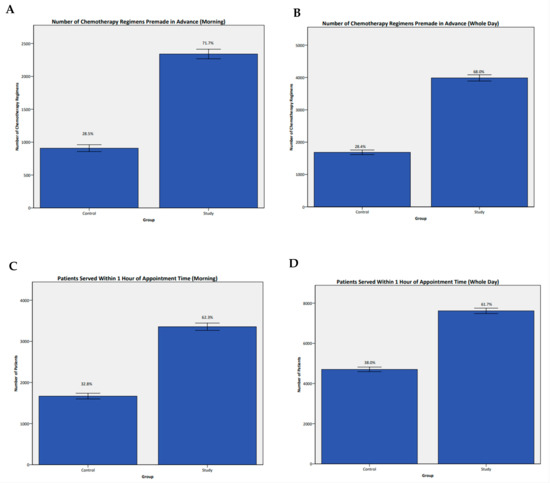p = 0.117). Of the regimens eligible to be pre-made, the proportion of regimens prepared a day in advance of the chemotherapy appointment increased from 908 (28.5%) in the control group to 2340 (71.7%) in the study group (
