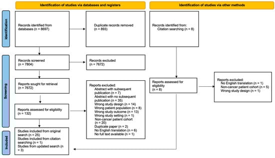 The search strategy identified 8697 references, although only 131 full text articles were retrieved (Figure 1). Twenty-six studies were identified during the initial database searches [15,16,17,18,19,20,21,22,23,24,25,26,27,28,29,30,31,32,33,34,35,36,37,38,39]; three further studies were identified during the re-searches in June 2023 [40,41,42]. The studies identified included 26 prognostication studies [15,16,17,18,19,20,21,22,23,24,25,26,27,28,29,30,31,32,33,34,37,38,39,40,41,43] and three non-prognostication studies [35,36,42]. Table 1 shows data from the prognostication studies (excluding one apparently overlapping study [37], one secondary analysis paper [38], one study involving patients that died after chemotherapy [39], and one study involving patients that died after ICU admission [43]).