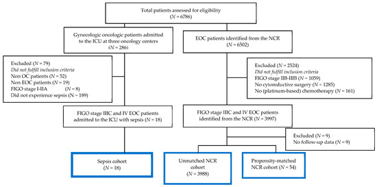 To identify advanced-stage EOC patients who experienced sepsis, gynecologic oncologic patients admitted to the ICU between 1 January 2006 and 1 January 2019 (to allow a last follow-up date of 31 January 2022) were selected from the following three Dutch hospitals: Radboud University Medical Center, Catharina Hospital, and Maastricht University Medical Center. Patients were identified from the hospitals’ electronic patient records using the search terms ‘neoplasm’ and ‘gynecology as the referring medical specialty’. Subsequently, patients were cross-checked with a list of all consecutive ovarian cancer patients who underwent treatment in the participating hospitals. Moreover, the study’s eligibility criteria required patients: