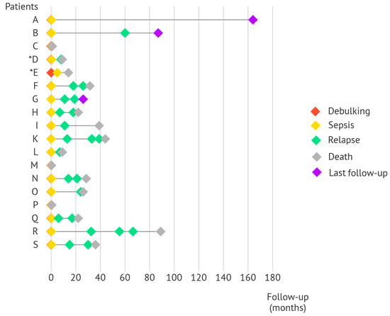 Timeline of the sepsis patients which outlines their oncologic outcomes. The timeline starts at the time of cytoreductive surgery. Sepsis occurred within a fortnight of cytoreductive surgery for 17/18 patients. As a result, the red diamond (indicative of cytoreductive surgery) is less noticeable for these patients. Patients C, M, and P died from the complications of sepsis. * Patients D and E experienced sepsis during treatment after cytoreductive surgery for first and second relapses, respectively.