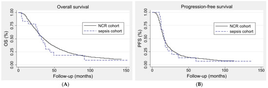 Figure 3A,B demonstrate the Kaplan–Meier survival curves used to calculate the median OS and PFS of the sepsis and unmatched NCR patients, respectively. The median (IQR) OS was 31 (24–44) months for the sepsis cohort compared to 35 (20–60) months for the unmatched NCR cohort (p = 0.56). The median (IQR) PFS was 16 (11–21) months for the sepsis cohort and 16 (11–27) months for the unmatched NCR cohort (p = 0.90). The Cox regression analyses demonstrated a HR of 1.16 (95%-CI 0.70–1.93) for the OS and a HR of 1.03 (95%-CI 0.61–1.75) for the PFS.