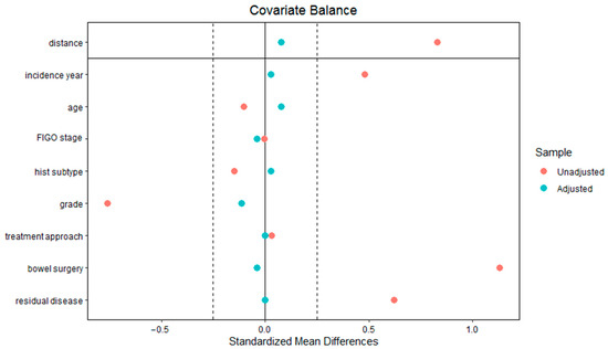 The Love plot demonstrates the absolute standardized mean difference of each variable in the unadjusted data (before propensity score matching) and adjusted data (after propensity score matching). The plot demonstrates that the covariates showed better balance in the adjusted data.