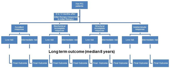 To verify our hypothesis, we evaluated the disease status at long-term follow-up in eight different subgroups of PTC patients, defined according to the response to initial therapy (excellent response, indeterminate response or biochemical or structural incomplete responses) and the ATA risk classes (low-, intermediate- or high-risk) [1].