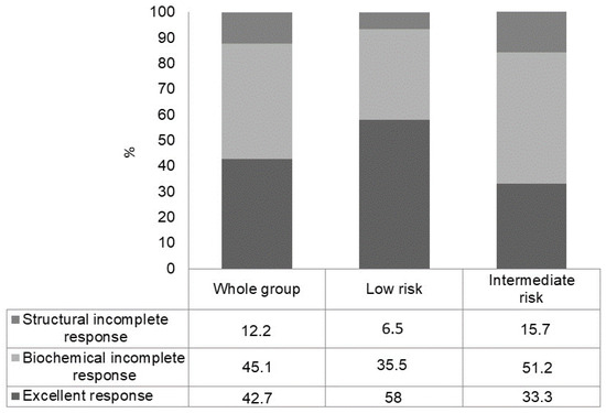 In the initial biochemical incomplete response subgroup (low- plus intermediate-risk patients) (n = 82), in the long-term follow-up, an excellent response was observed in 35/82 (42.7%) patients, a persistent biochemical incomplete response in 37/82 (45.1%) patients and a structural incomplete response in 10/82 (12.2%) cases (Figure 2). The rate of excellent response was significantly higher in low-risk PTC patients (58.0%) than in intermediate-risk PTC patients (33.3%) (p = 0.007) (Figure 3).