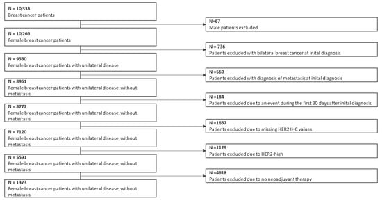 The eligibility of patients for inclusion in the study was defined by the following criteria. Excluded from the study, among the 10,333 patients who were at least 18 years of age and had been diagnosed with invasive breast cancer were male patients, those with bilateral breast or metastatic breast cancer, patients with events during the first 30 days after initial diagnosis, patients with missing HER2 IHC data, and HER2-positive (categorized as IHC score of 3+ or IHC score of 2+ with positive ISH findings) patients. The final sample consisted of 1373 patients (Figure 1). The ethics committee of Erlangen University Hospital provided approval for the study (ref. numbers 2700 and 297 17 Bc).