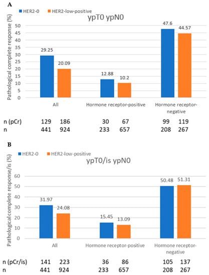 (A,B) Pathological complete response (pCR) rates in patients with HER2-0 and HER2-low-positive breast cancer. Comparison of pCR rates (A) and pCR/is, irrespective of in situ lesions (B).