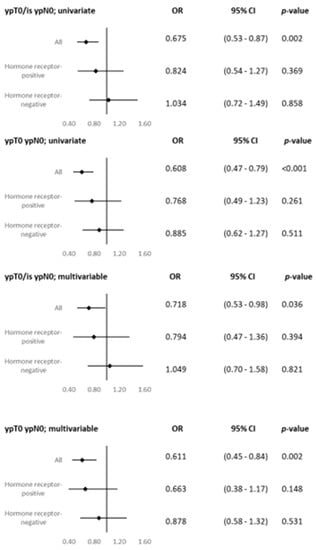 Denkert et al. published a pooled analysis of patients treated in four different neoadjuvant trials in order to compare HER2-0 and HER2-low-positive tumors. HER2-low-positive, HR-positive tumors were found to be associated with a significantly lower pCR rate in comparison with HER2-0, as well as significantly longer 3-year DFS (83.4% vs. 76.1%) and 3-year OS rates (91.6% vs. 85.8%). The same was reported for HR-negative tumors for DFS (82.8% vs. 79.3%), but not for OS []. In the present analysis, the pCR rates were also statistically significantly different between HER2-0 and HER2-low-positive tumors (p < 0.001)—29.3% in HER2-0 patients and 20.1% in HER2-low-positive patients. No significant differences were observed in the HR-positive or HR-negative subgroups (HR-positive p = 0.315, HR-negative p = 0.573). The univariate and multivariate analyses showed that patients with HER2-0 tumors have a statistically significantly higher chance for pCR (for example, in the multivariable analysis, ypT0 ypN0: OR 0.611, 95% CI, 0.45 to 0.84, p = 0.002), but no differences were seen in the HR-positive or HR-negative subgroups. The effect seen in the overall group therefore seems to be more of a statistical carry-over effect out of the HR-negative patient group than a clinical effect. Differences between these results and Denkert et al. include their period of recruitment, which was between 2012 and 2019, compared to 1998 until now in the present study, and the possible therapeutic effect of study drugs not used in clinical routine work (for example, nab-paclitaxel, denosumab, and trastuzumab s.c.) in comparison with the real-world analysis. This might also influence the OR []. Kang and coworkers reported similar results, with a significantly higher pCR rate for HER2-0 patients (14.7% vs. 9.8%, p = 0.003) in comparison with HER2-low-positive patients, but no differences in the HR-positive (p = 0.4) or HR-negative subgroups (p = 0.3) []. Another group of researchers also reported results similar to those in the present study. A total of 675 patients with neoadjuvant chemotherapy were analyzed, and those with HER2-0 tumors had significantly higher pCR rates than HER2-low-positive patients (26.6% vs. 16.6%, p = 0.002). Similarly, no statistically significant differences in pCR rates between HER2-low-positive and HER2-0 tumors were seen in the HR-positive or HR-negative subgroups [].