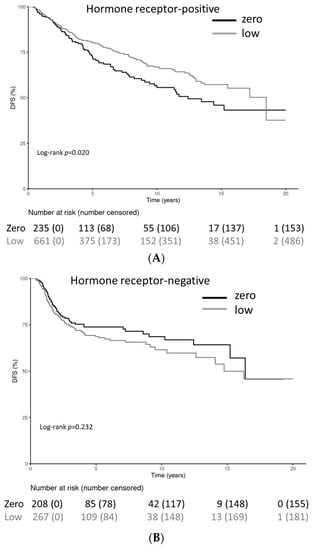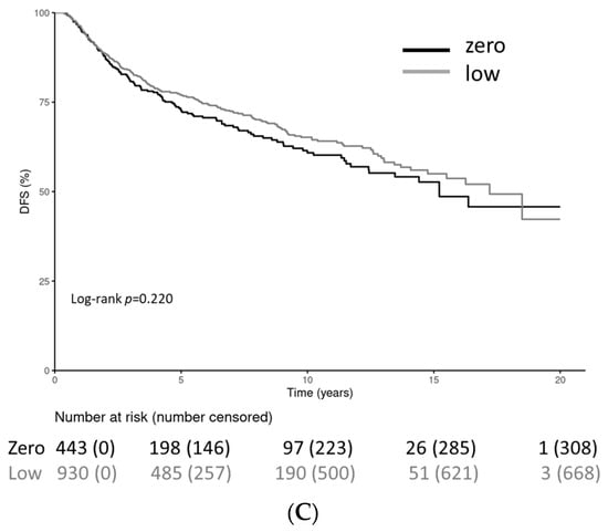Patients with HER2-low-positive and HR-positive tumors had significantly longer DFS periods (stratified log-rank test p = 0.02). No statistically significant differences were observed for the HR-negative cohort (stratified log-rank test p = 0.232) (Figure 4A–C). The DFS rates at 20 years for HR-positive patients were 43.2% (34.1–54.9%) for the HER2-0 cohort and 37.7% (20.5–69.3%) for the HER2-low-positive cohort. DFS rates at 20 years for HR-negative patients were not applicable for the HER2-0 cohort and 45.8% (33.9–61.9%) for the HER2-low-positive cohort; after 10 years, the DFS was 68.6% (62.1–77.0%) for the HER2-0 cohort and 61.5% (54.4–69.6%) for the HER2-low-positive cohort.