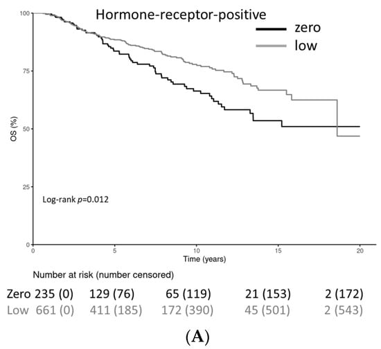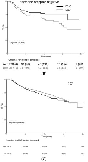 Patients with HER2-low-positive tumors had a statistically significantly longer OS in the HR-positive cohort (stratified log-rank test p = 0.012) and a statistically significantly shorter OS with HR-negative tumors (stratified log-rank test p = 0.032) (Figure 5A–C). The OS rate for HR-positive patients at 20 years was 51.0% (41.5–62.6%) for the HER2-0 cohort and 46.9% (26.2–83.8%) for the HER2-low-positive cohort. The OS rate for HR-negative patients at 10 years was 77.2% (70.3–84.8%) for the HER2-0 cohort and 67.2% (60.1–75.0%) for the HER2-low-positive cohort; after 20 years, it was not applicable for the HER2-0 cohort and 46.0% (33.3–63.6%) for the HER2-low-positive cohort.