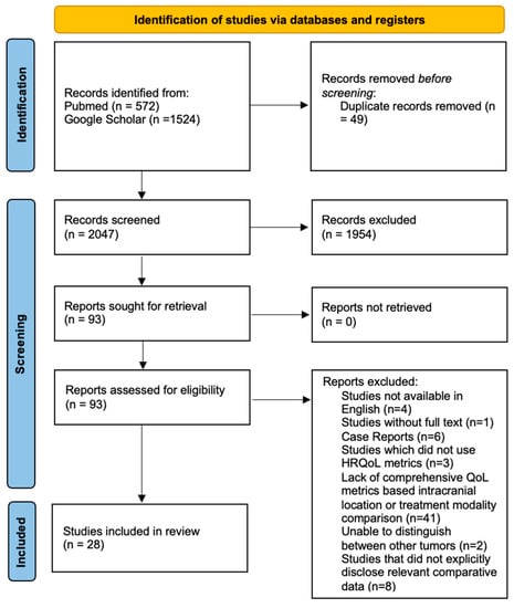 Exclusion criteria involved studies that did not explicitly disclose relevant qualitative or comparative data for subjects (n = 8), incomprehensive studies that did not report QOL metrics based upon intracranial location or treatment modality (n = 41), studies in which patient data were unable to be distinguished from other brain lesions including but not limited to gliomas (n = 2), studies that solely examined cognitive dysfunction without utilizing an HRQoL instrument (n = 3), case reports (n = 6), those unavailable in English (n = 4) and those without full-text availability (n = 1). Relevant studies were included from article references when applicable (n = 6). This resulted in 65 references being discarded, leaving 28 studies (Figure 1).