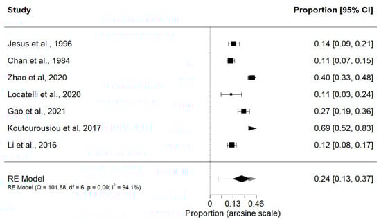 - Schwarzer, G.; Chemaitelly, H.; Abu-Raddad, L.J.; Rücker, G. Seriously Misleading Results Using Inverse of Freeman-Tukey Double Arcsine Transformation in Meta-Analysis of Single Proportions. Res. Synth. Methods 2019, 10, 476–483. [Google Scholar] [CrossRef]