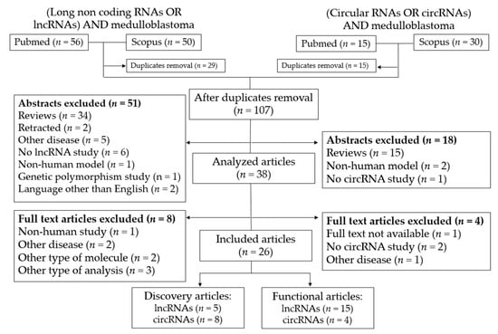 The inclusion criteria permitted the selection of original studies performed in MB patients or cell lines analyzing lncRNA or circRNA differential expression (DE) in relation to diagnosis, classification, prognosis, and treatment response or their function. Articles were excluded if they analyzed a disease other than MB, non-coding RNAs other than lncRNAs or circRNAs, features other than RNA expression, or organisms other than humans. In addition, articles not published in English were also excluded. I.M.d.E. and A.J. independently screened the studies and collected the relevant information. Any discrepancies concerning eligibility were resolved through discussion.