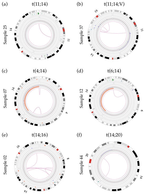 Circos plots showing primary IGH translocations: (a) Sample 25 showing a two-way t(11;14) translocation involving the IGH gene and unknown sequences at chromosomal band 11q13.3. The breakpoint is located between the genes MYEOV and CCND1 and does not involve any previously known gene; (b) sample 37 showing a variant t(11;14;19) translocation involving the IGH gene and the gene LINC01488 (between MYEOV and CCND1) at band 11q13.3. Refer to Section 3.7 for details of t(11;14) breakpoints; (c) sample 07 showing a t(4;14) translocation with a rearrangement of the IGH gene (14q32) and a disruption of the NSD2 gene (4p16.3; breakpoint at label 1 901 670 bp); (d) sample 12 showing a t(6;14) translocation with a rearrangement of the IGH gene and a breakpoint within the CCND3 gene (6p21.1; break at label 41 969 985 bp); (e) sample 02 showing the t(14;16) translocation involving the IGH gene and the WWOX gene (16q23, break at label 78 739 024 bp); (f) sample 44 showing the t(14;20) translocation involving the IGH gene and unknown sequences at chromosomal band 20q12. The breakpoint of this translocation (label 40 260 220) is located 427 788 bp in front of the MAFB gene (label 40 688 008) and does not involve any previously known gene within this region.